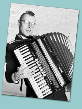 The accordion was invented in Germany in the early 19th century and quickly spread throughout the world. It's portability, flexibility and loud volume made it a tremendously popular folk instrument, becoming the driving sound in a variety of musical styles from French musette to zydeco, Argentine tango to Klezmer. In North America the accordion suffered a big blow in popularity with the rise of the electric guitar. The squeezebox became associated exclusively with polkas and Lawrence Welk, and by the 1980's it had become the musical symbol of nerdiness.